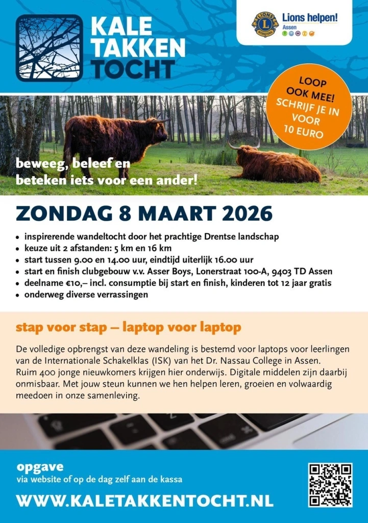 Lions Club Assen organiseert deze wandeling om geld in te zamelen voor de aanschaf van laptops voor leerlingen van de Internationale Schakelklas (ISK) van het Dr. Nassau College in Assen. Zij wordt daarbij financieel en in natura geholpen door diverse sponsors en organisaties.